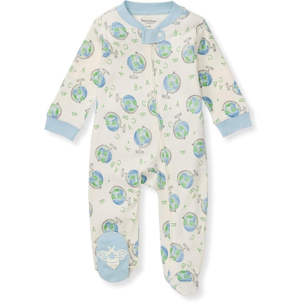 Burt’s Bees Baby Boys Sleep and Play PJs, 100% Organic Cotton One-Piece Zip Front Romper Jumpsuit Pajamas(Little Globe)