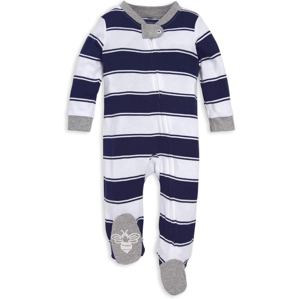 Burt’s Bees Baby Boys Sleep and Play PJs, 100% Organic Cotton One-Piece Zip Front Romper Jumpsuit Pajamas(Navy Rugby Stripe)